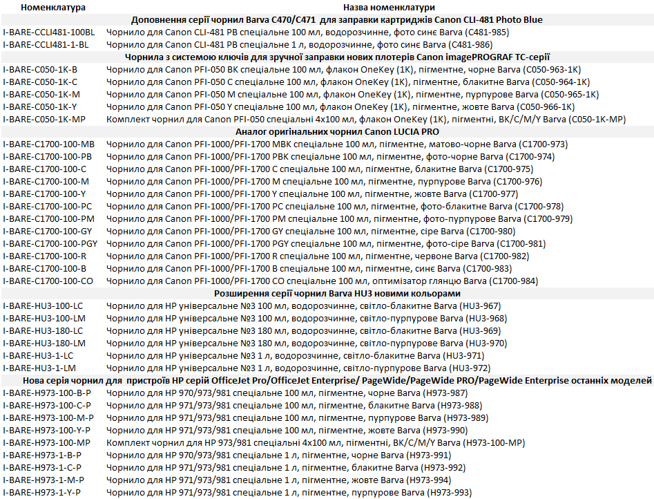Потрібні якісні чорнила для пристроїв Canon чи HP? Новинки в асортименті Barva вже доступні для замовлення. Чорнила для принтерів ТМ Barva забезпечують яскраві кольори, чіткість друку та стабільну роботу пристроїв.