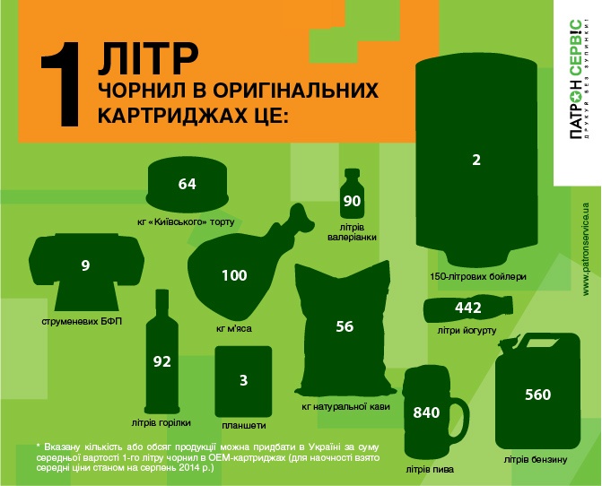 В Україні за суму середньої вартості 1-го літра чорнил в ОЕМ-картриджах можна придбати вказану кількість або обсяг продукції (для наочності взяті середні ціни станом на серпень 2014 р.):