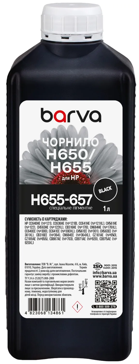Чорнило для HP 122/178/650/655 спеціальне 1 л, пігментне, чорне Barva (H655-657) опис: