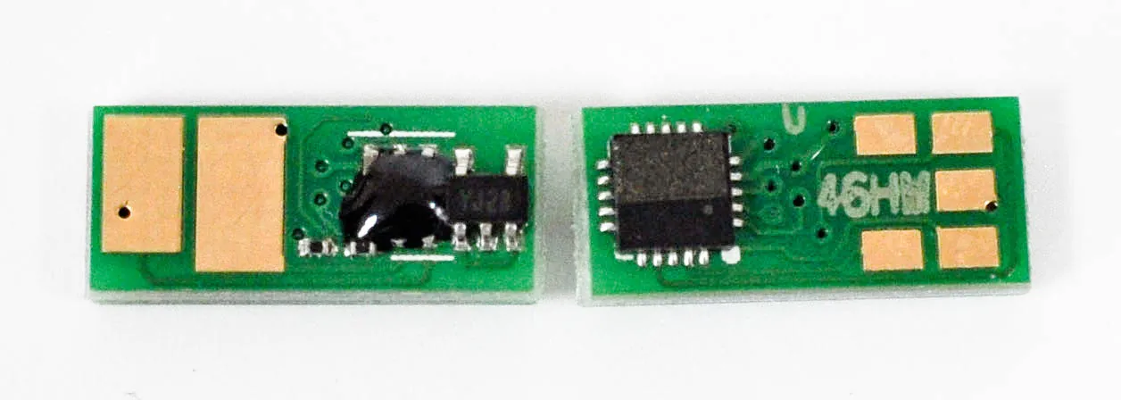 Чіп - це не велика за розміром мікросхема, в яку вшита інформація про ресурс самого картриджа, забезпечений функцією обміну даними з принтером. Простіше кажучи, завдяки чіпу апарат може порахувати кількість надрукованих сторінок. У момент, коли лічильник сторінок підійшов до кінця, ви побачите попередження про те, що картридж закінчився і його необхідно замінити, навіть якщо в бункері картриджа залишився невикористаний тонер.