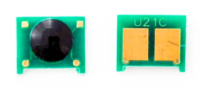 Чіп - це не велика за розміром мікросхема, в яку вшита інформація про ресурс самого картриджа, забезпечений функцією обміну даними з принтером. Простіше кажучи, завдяки чіпу апарат може порахувати кількість надрукованих сторінок. У момент, коли лічильник сторінок підійшов до кінця, ви побачите попередження про те, що картридж закінчився і його необхідно замінити, навіть якщо в бункері картриджа залишився невикористаний тонер.