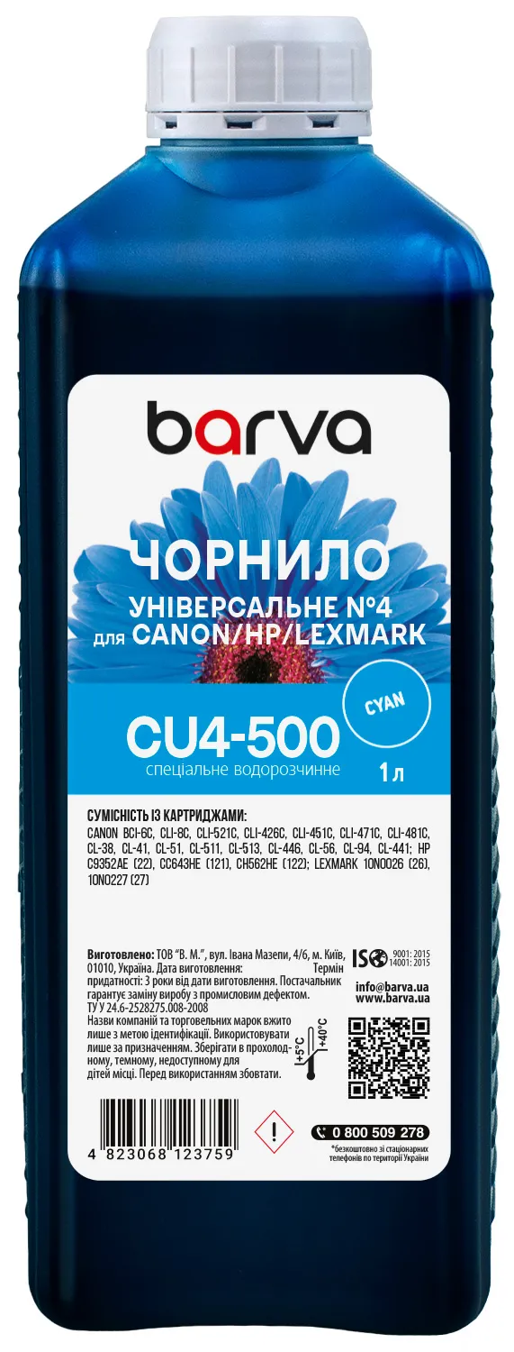 Ви можете купити Чорнило для Canon/HP/Lexmark універсальне №4 1 л, водорозчинне, блакитне Barva (CU4-500) в нашому інтернет-магазині з доставкою по Києву та всій Україні.