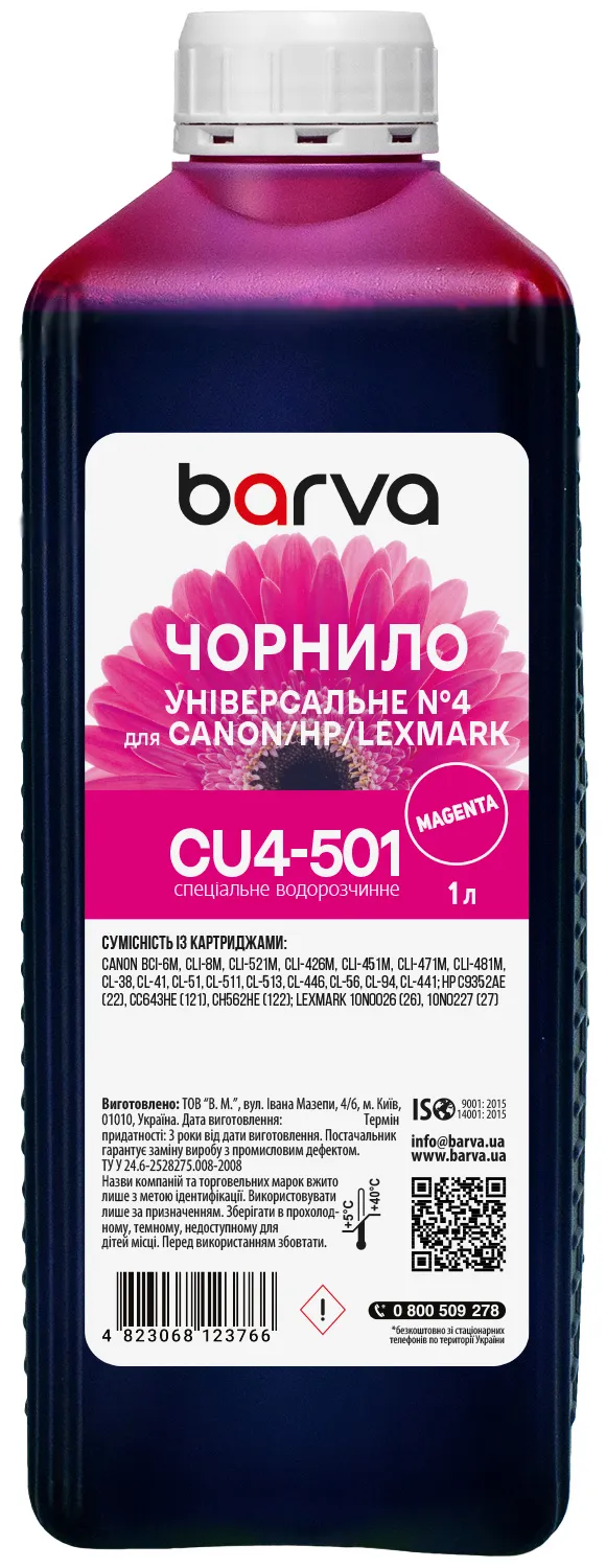 Чорнило для Canon/HP/Lexmark універсальне №4 1 л, водорозчинне, пурпурове Barva (CU4-501) опис: