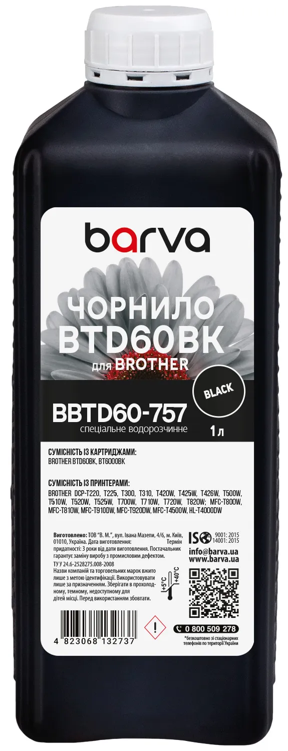 - Чорнило для Brother BTD60BK спеціальне 1 л, водорозчинне, чорне Barva (BBTD60-757)
