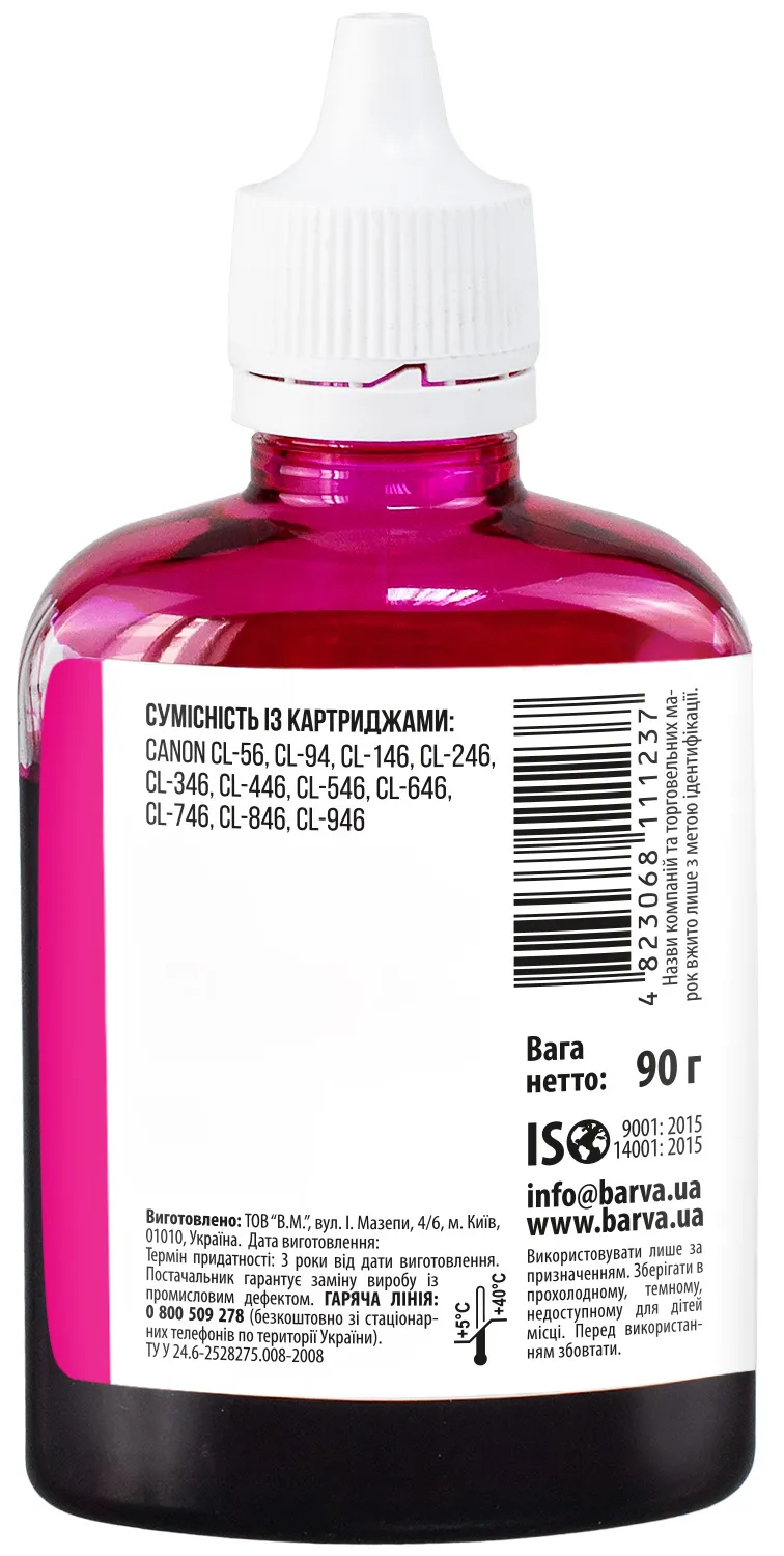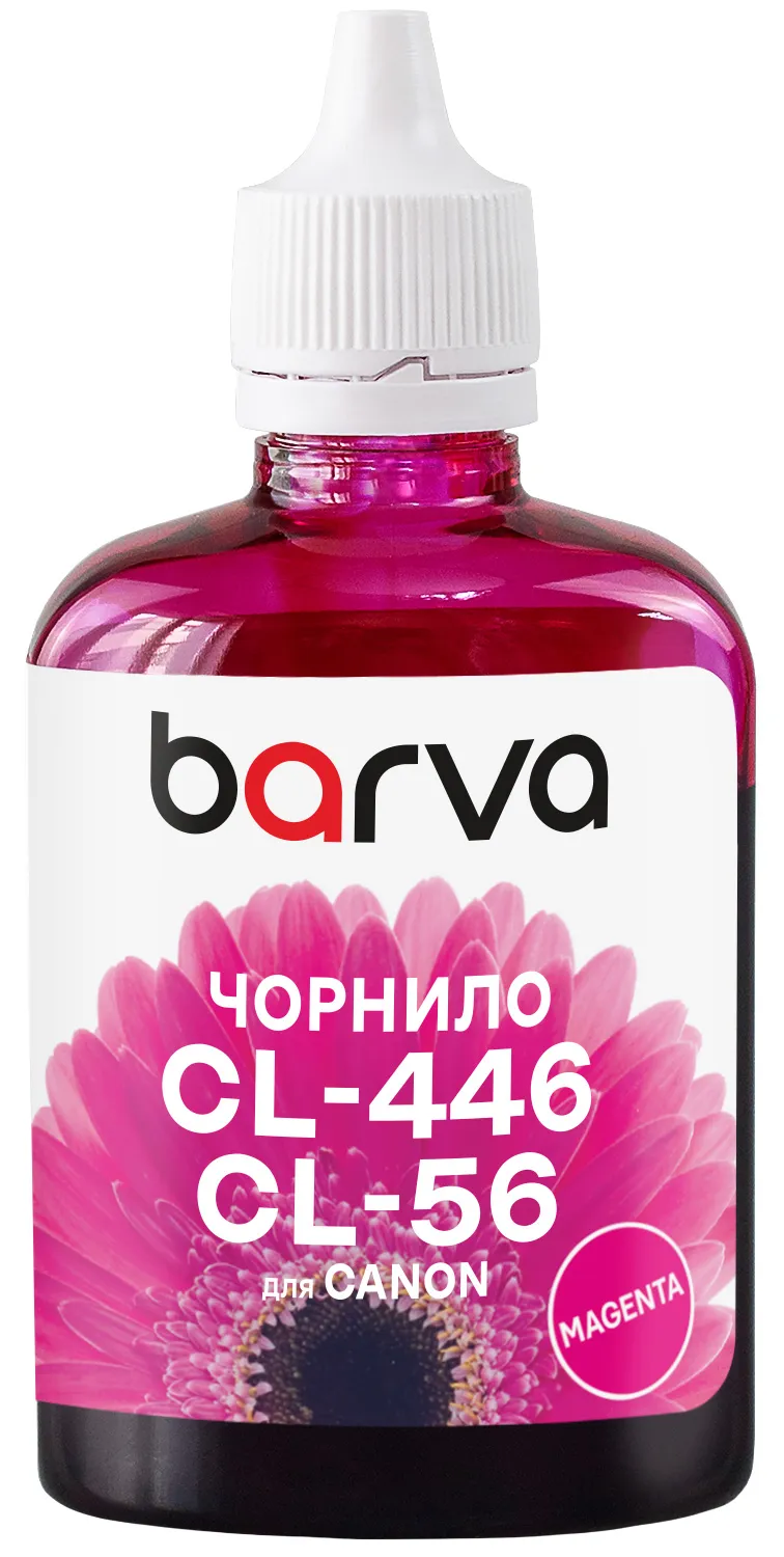Більшість з нас чули, що на відміну від лазерної техніки, яка формує зображення за допомогою тонера, струменева техніка використовує для друку спеціальні чорнила (краска для принтерів). Чорнило сумісне для Canon CL-446/CL-56/CL-94 спеціальне 90 г, водорозчинне, пурпурове Barva (C446-439) використовується переважно для заправки ПЗК та СБПЧ. Заправка картриджу також можлива, для цього необхідно зняти носик та вилучити чорнила шприцом.