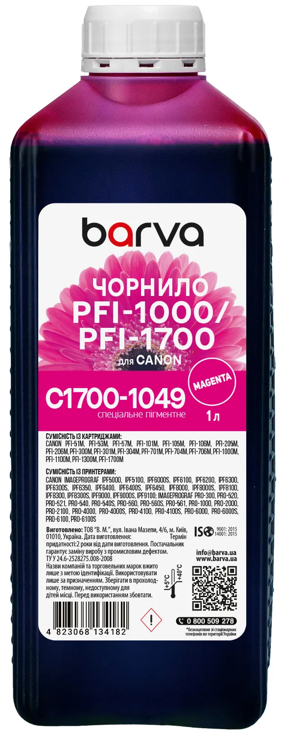 Чорнило для Canon PFI-1000/PFI-1700 M спеціальне 1 л, пігментне, пурпурове Barva (C1700-1049) опис: