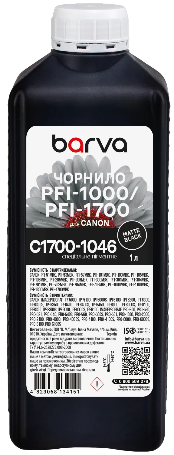 Чорнило для Canon PFI-1000/PFI-1700 MBK спеціальне 1 л, пігментне, матово-чорне Barva (C1700-1046) опис: