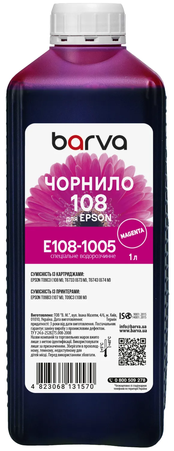 Чорнила E108-1005 Barva мають офіційну гарантію від виробника – ТОВ "В.М.".