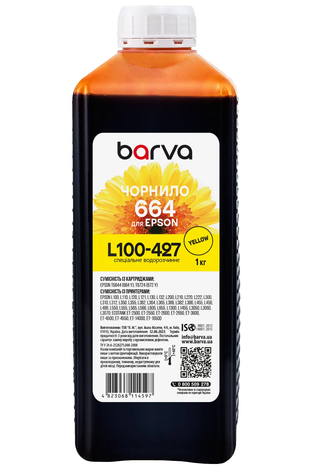 Чорнило сумісне для Epson 664 Y спеціальне 1 кг, водорозчинне, жовте Barva (L100-427) опис: