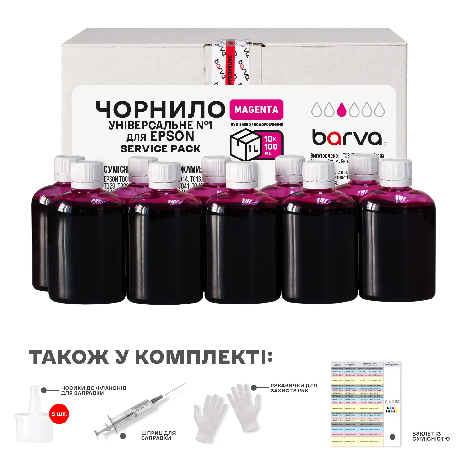 Чорнило сумісне для Epson універсальне №1 10x100 мл, водорозчинне, пурпурове Service Pack Barva (EU1-1SP-M) опис: