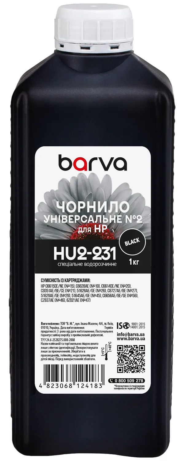 Чорнило для HP універсальне №2 1 л, водорозчинне, чорне Barva (HU2-231) опис: