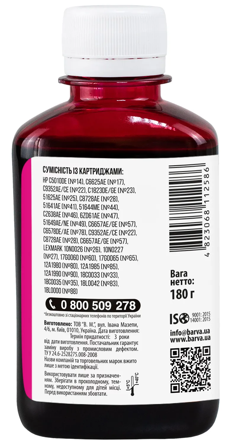 - Фасовка чорнил Barva 180 гр./180 мл буде зручною для користувачів, якім необхідно багато друкувати – в даному випадку вартість чорнил буде нижчою, ніж в більш маленьких фасовках (90 гр. або 100 мл).