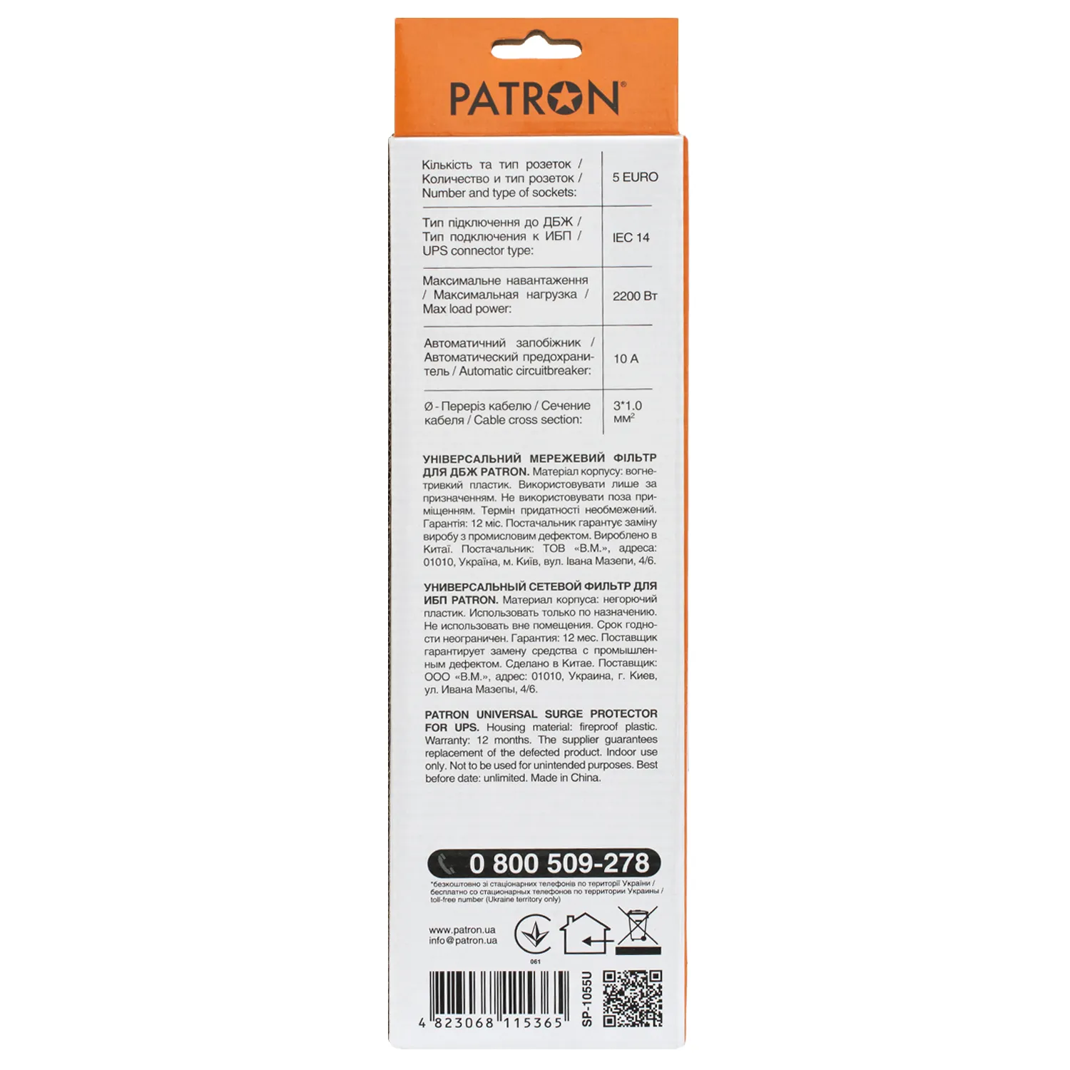 Фільтр мережевий для ДБЖ 5 розеток, 2 м, чорний, 3*1мм2 Patron (SP-1055U)
