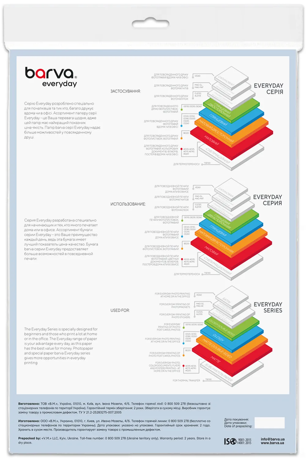 Під торговою маркою Barva на ринок виходить широкий асортимент матеріалів для струменевого друку, який допоможе Вам з виконанням різних завдань - від друку фотографій, до виготовлення рекламних і маркетингових матеріалів. Носії для струминного друку під цією торговою маркою випускаються на ринок українською компанією ТОВ «В. М. » з 2003 року і вже встигли завоювати довіру користувачів незмінно високою якістю та доступними цінами.