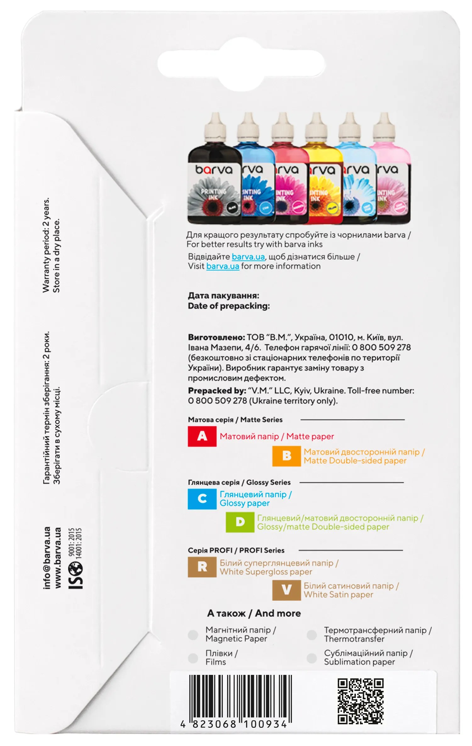 Під торговою маркою Barva на ринок виходить широкий асортимент матеріалів для струменевого друку, який допоможе Вам з виконанням різних завдань - від друку фотографій, до виготовлення рекламних і маркетингових матеріалів. Носії для струминного друку під цією торговою маркою випускаються на ринок українською компанією ТОВ «В. М. » з 2003 року і вже встигли завоювати довіру користувачів незмінно високою якістю та доступними цінами.