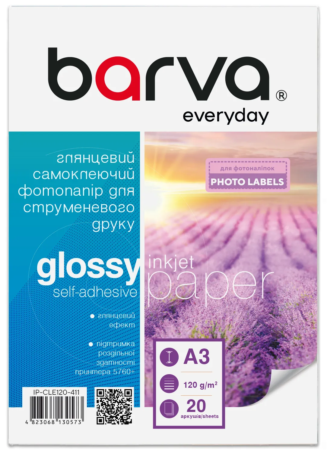 Фотопапір глянцевий самоклеючий 120 г/м2, A3, 20 арк Everyday Barva (IP-CLE120-411)