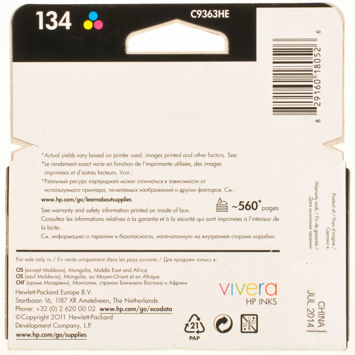 Струменевий картридж C9363H HP має ресурс – 560 сторінок.