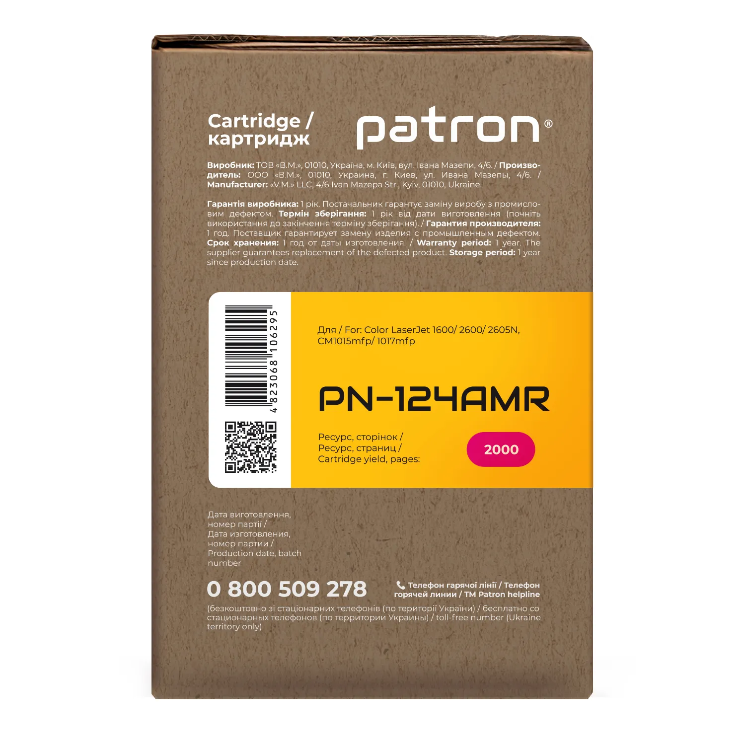 Ми потурбувалися про те, щоб упаковка картриджа була не лише екологічною, функціональною, мала мінімально можливі фізичні розміри, але і містила усю необхідну інформацію. На яскраво-помаранчевій етикетці знаходиться інформація про картридж, його сумісність з друкувальними пристроями, номер партії, дата виготовлення, контакти виробника, а також номер телефону безкоштовної гарячої лінії для українських споживачів.