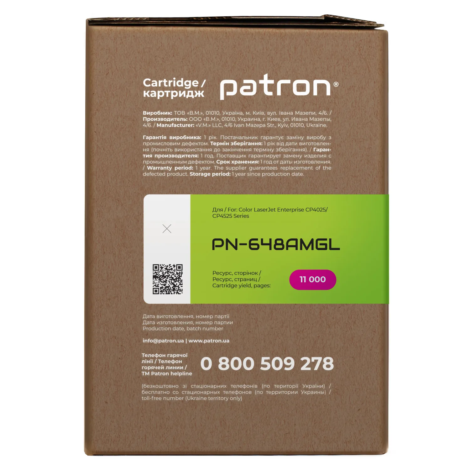 Ми потурбувалися про те, щоб упаковка картриджа була не лише екологічною, функціональною, мала мінімально можливі фізичні розміри, але і містила усю необхідну інформацію. На зеленій етикетці знаходиться інформація про картридж, його сумісність з друкувальними пристроями, номер партії, дата виготовлення, контакти виробника, а також номер телефону безкоштовної гарячої лінії для українських споживачів.