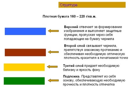 Для качественной струйной печати существует несколько сортов со специфическим покрытием. Данное покрытие предотвращает произвольное растекание чернил и последующее искажение отпечатка. Именно эта бумага очень хорошо дифференцируется согласно описанным в начале статьи характеристикам: существует бумага для струйной печати повышенной плотности, повышенной белизны, повышенной жесткости, и т.д.. Кроме того имеется некоторая оптимизация нанесенного покрытия под определенный тип чернил. Диапазон плотности такой бумаги обычно укладывается в 90-100 г/м2, хотя бывают и более массивные до 250-300 г/м2 (heavy). Бумага небольшой плотности отлично выдерживает цветную деловую графику (офисные цветные шрифты, простые логотипы, графики, цветные таблицы и т.п.). Можно печатать на ней и фотографии: при использовании фотопринтера с качественными чернилами цветопередача происходит отлично, но сам лист не выдерживает сильного потока чернил и в какой-то степени обязательно деформируется и размокает. Поэтому для струйной фотопечати существует специальная бумага с большей плотностью, которая так и называется photo paper, или просто фотобумага.