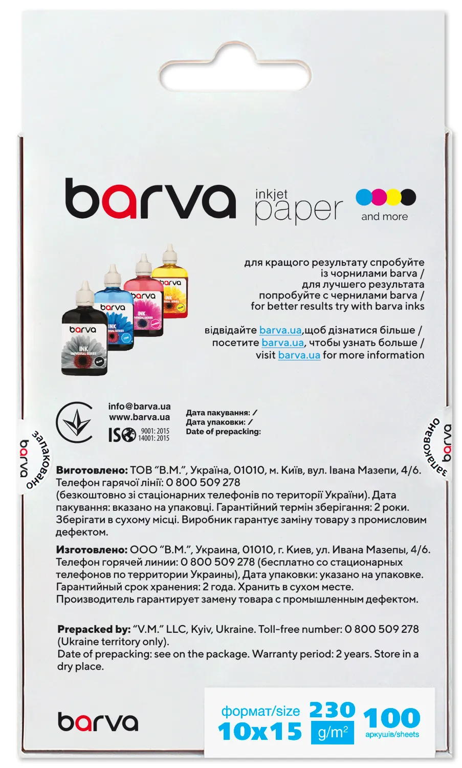 Под торговой маркой Barva на рынок выходит широкий ассортимент материалов для струйной печати, который поможет Вам с выполнением различных задач – от печати фотографий, до изготовления рекламных и маркетинговых материалов. Носители для струйной печати под данной торговой маркой выпускаются на рынок украинской компанией ТОВ «В. М.» с 2003 года и уже успели завоевать доверие пользователей неизменно высоким качеством и доступными ценами.