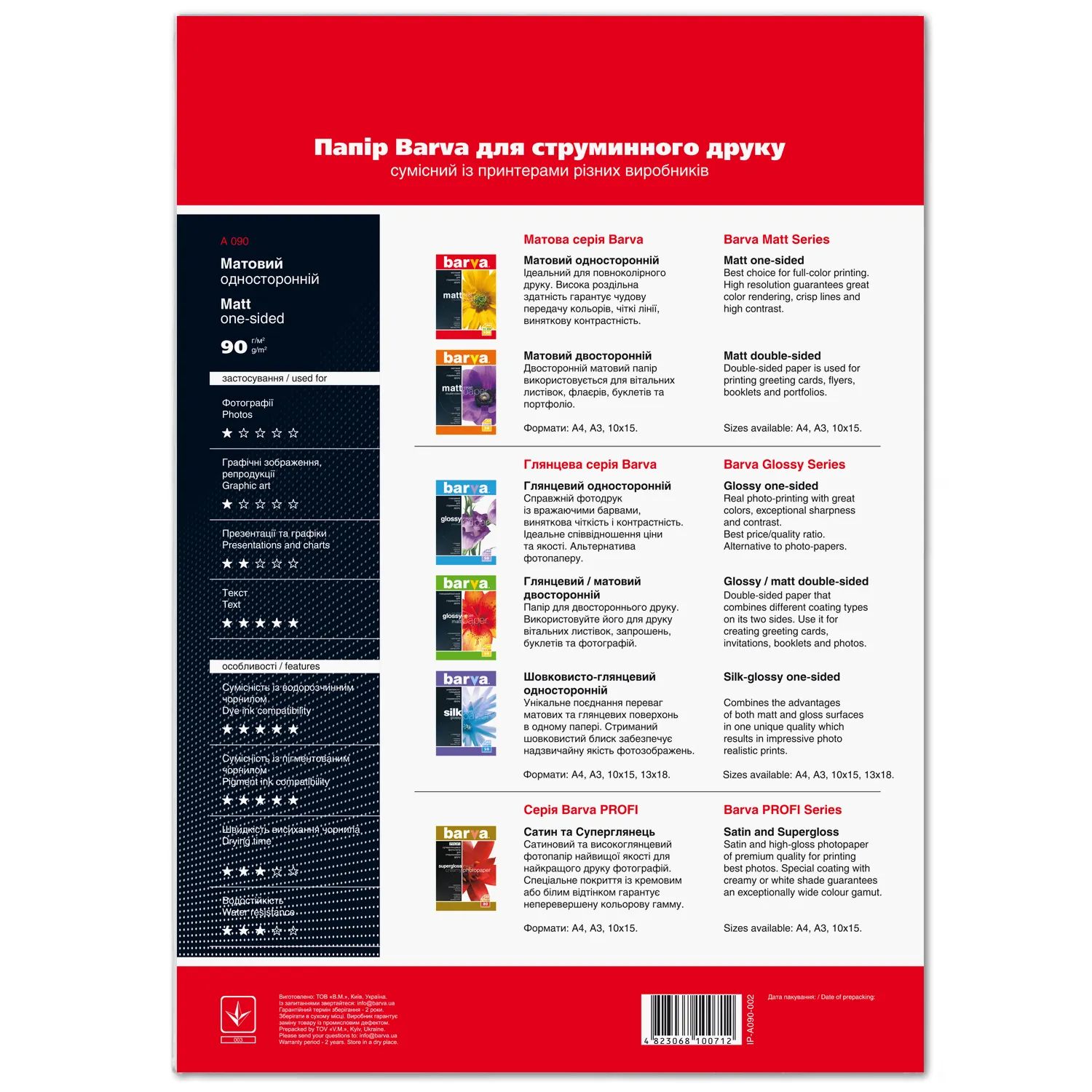 Под торговой маркой Barva на рынок выходит широкий ассортимент материалов для струйной печати, который поможет Вам с выполнением различных задач – от печати фотографий, до изготовления рекламных и маркетинговых материалов. Носители для струйной печати под данной торговой маркой выпускаются на рынок украинской компанией ТОВ «В. М.» с 2003 года и уже успели завоевать доверие пользователей неизменно высоким качеством и доступными ценами.