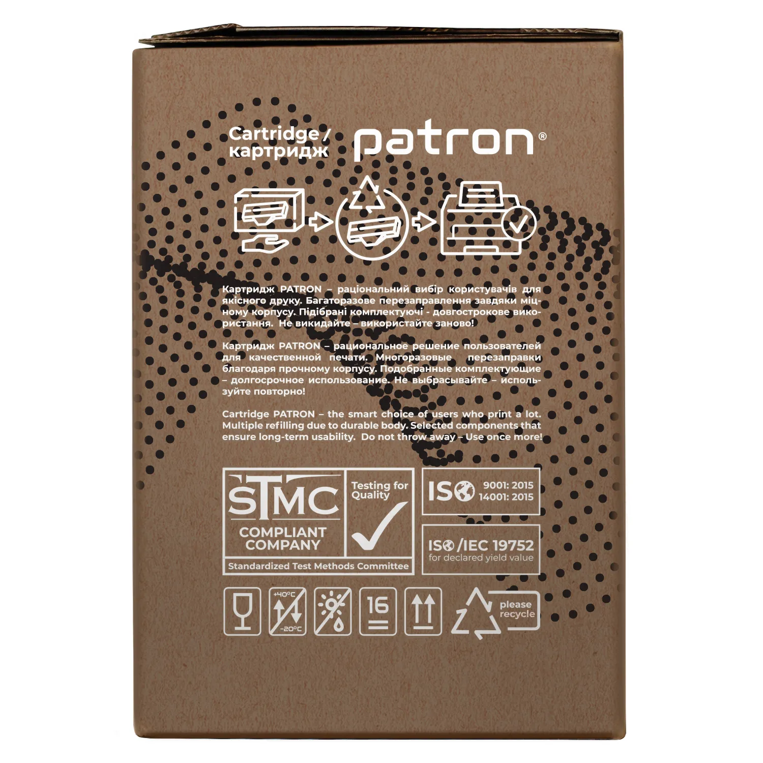 Производство картриджей Patron Green Label происходит с выполнением требований международного стандарта по защите окружающей среды- ISO 14001:2015.