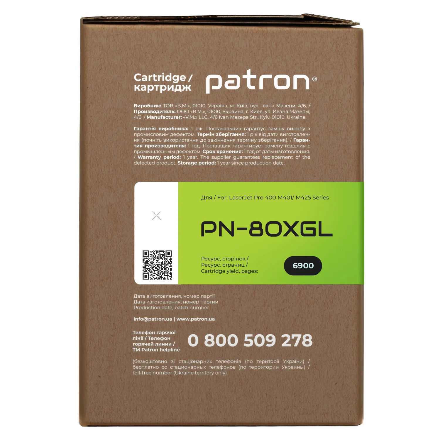 Мы позаботились о том, чтобы упаковка картриджа была не только экологичной, функциональной, имела минимально возможные физические размеры, но и содержала всю необходимую информацию. На зеленой этикетке находится информация о продукте, его совместимости с печатающими устройствами, номер партии, дата изготовления, контакты производителя, а также номер телефона бесплатной горячей линии для украинских потребителей.