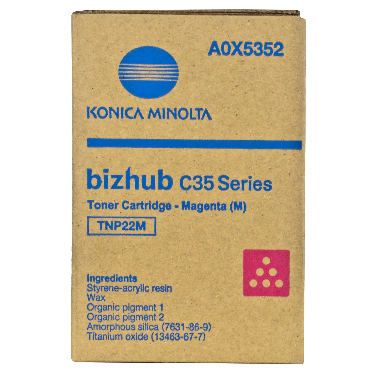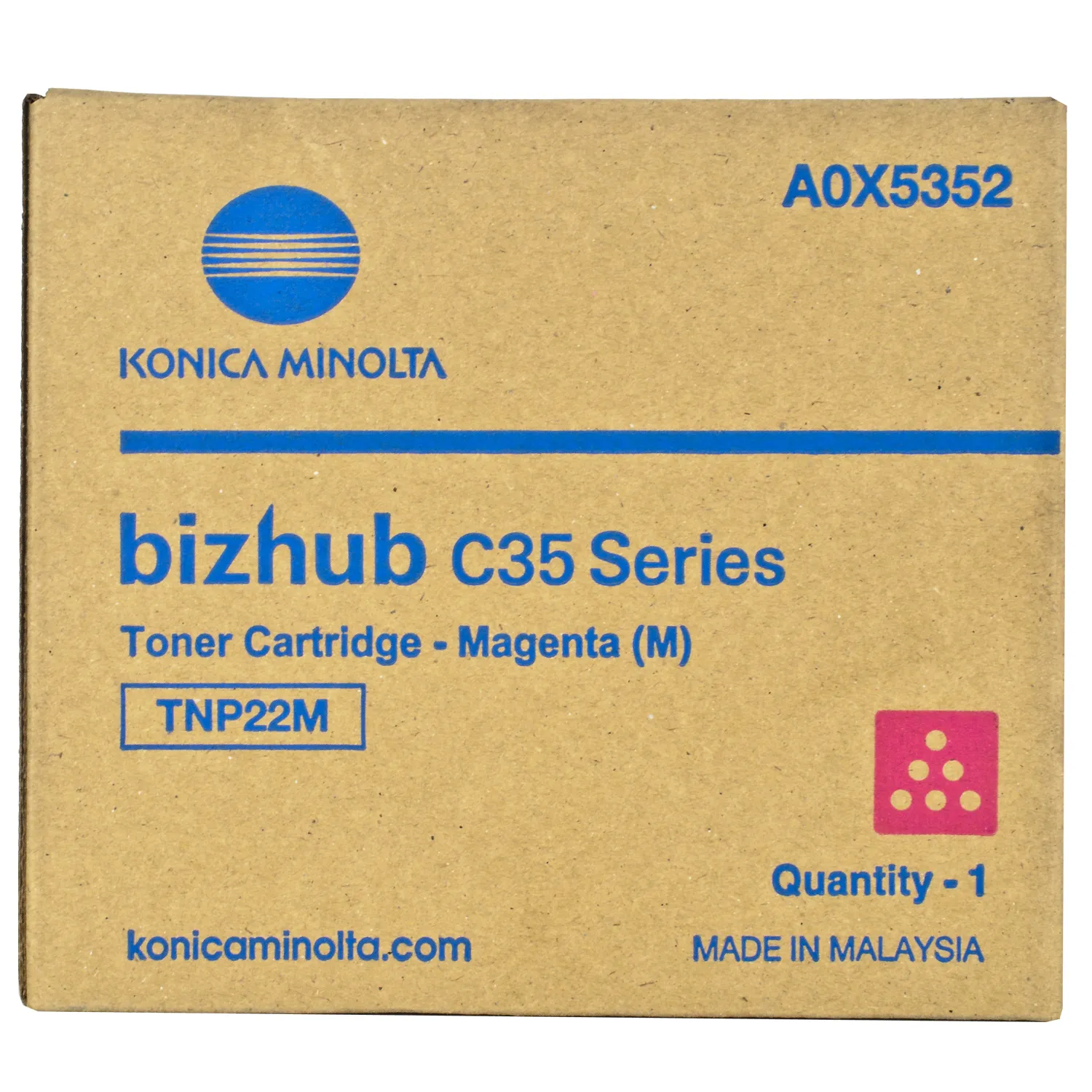Картридж A0X5352 розроблений та виробляється компанією Konica Minolta, тому він є ідеальним вибором для бездоганної якості друку. Можна із впевненістю розраховувати, що оригінальний картридж для лазерного принтера Konica Minolta буде безвідмовно працювати протгом всього ресурсу – 6000 сторінок. Тонер-картридж TNP-22M пурпуровий Konica Minolta (A0X5352) відноситься до групи оригінальних витратних матеріалів, єдиним мінусом яких є висока вартість.